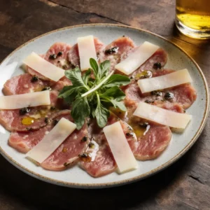 Carpaccio de ternera acompañado con rúcula, tomate cherry,citronette y lascas de parmesano