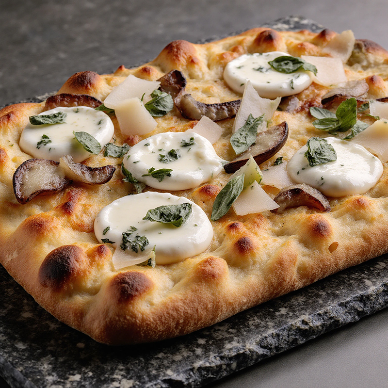Crema de Boletus, Mozzarella, crema de burrata, carpaccio de trufa negra y lascas de parmesano